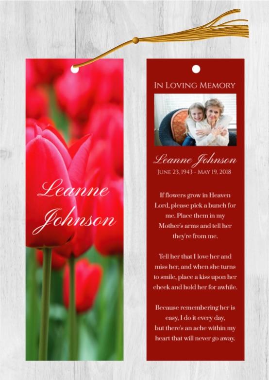 - Our memorial bookmarks (front and back) are 2.5″x8.5″