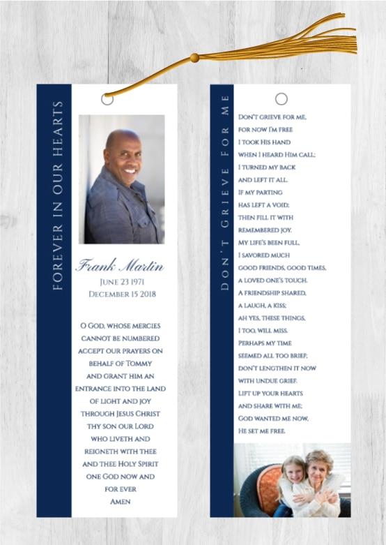 Free UPS 2-day Air Shipping Included with orders over $50 (overnight shipping is available). Orders are printed and shipped the following day after the order is placed. No need to wait for a designer, you can customize this design yourself with our online design tool! It’s simple and easy. Just select the options below and click the “next” button to customize the design with your text and photos. You can also choose to have us customize the design for you. Our memorial bookmarks (front and back) are 2.5″x8.5″. All memorial bookmarks are printed on 110lb matte cover card stock or 110lb glossy cover card stock.
