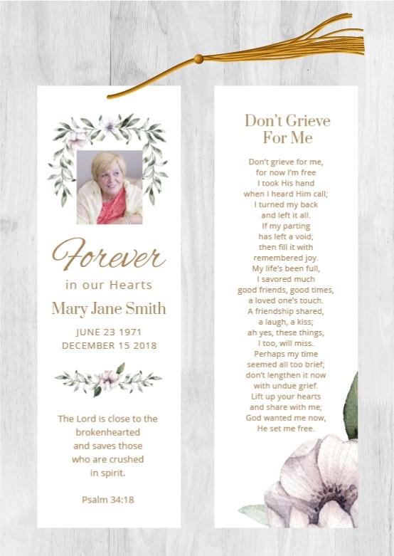 • Our memorial bookmarks (front and back) are 2.5″x8.5″