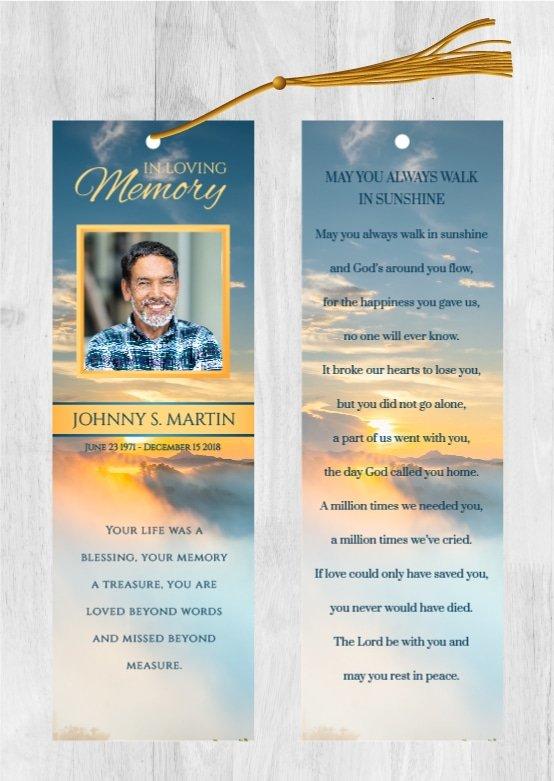 Free UPS 2-day Air Shipping Included with orders over $50 (overnight shipping is available). Orders are printed and shipped the following day after the order is placed. No need to wait for a designer, you can customize this design yourself with our online design tool! It’s simple and easy. Just select the options below and click the “next” button to customize the design with your text and photos. You can also choose to have us customize the design for you. Our memorial bookmarks (front and back) are 2.5″x8.5″. All memorial bookmarks are printed on 110lb matte cover card stock or 110lb glossy cover card stock.