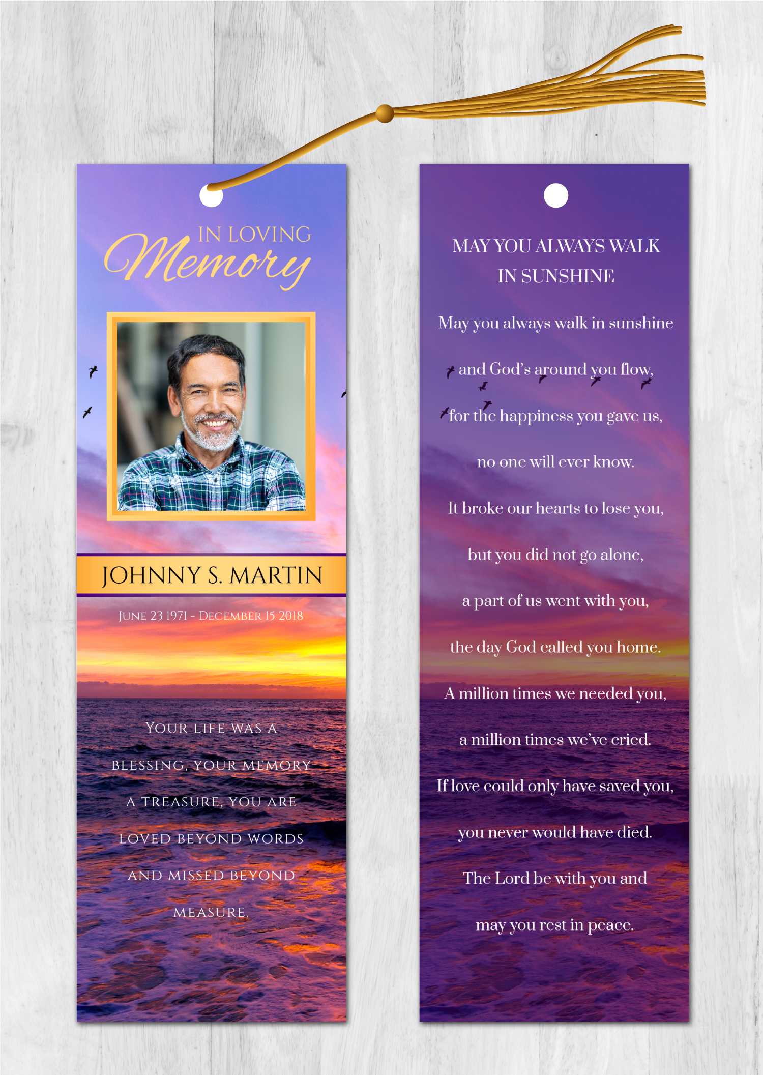 Free UPS 2-day Air Shipping Included with orders over $50 (overnight shipping is available). Orders are printed and shipped the following day after the order is placed. No need to wait for a designer, you can customize this design yourself with our online design tool! It’s simple and easy. Just select the options below and click the “next” button to customize the design with your text and photos. You can also choose to have us customize the design for you. Our memorial bookmarks (front and back) are 2.5″x8.5″. All memorial bookmarks are printed on 110lb matte cover card stock or 110lb glossy cover card stock.