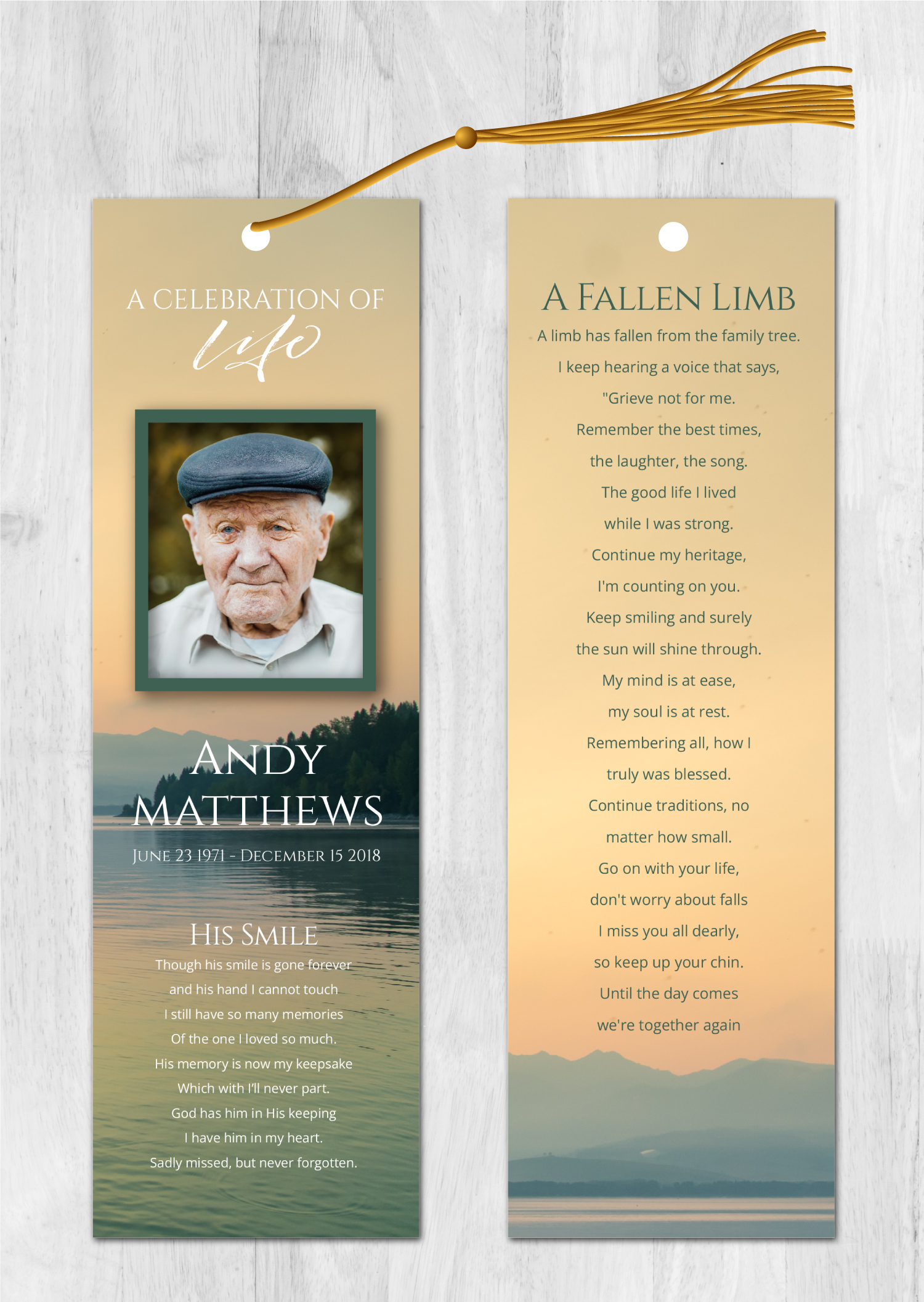 Free UPS 2-day Air Shipping Included with orders over $50 (overnight shipping is available). Orders are printed and shipped the following day after the order is placed. No need to wait for a designer, you can customize this design yourself with our online design tool! It’s simple and easy. Just select the options below and click the “next” button to customize the design with your text and photos. You can also choose to have us customize the design for you. Our memorial bookmarks (front and back) are 2.5″x8.5″. All memorial bookmarks are printed on 110lb matte cover card stock or 110lb glossy cover card stock.