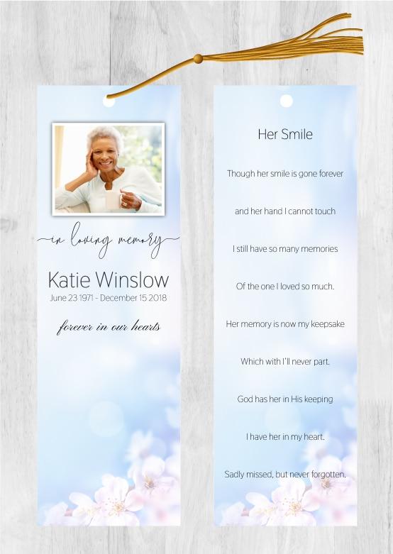 • Our memorial bookmarks (front and back) are 2.5″x8.5″