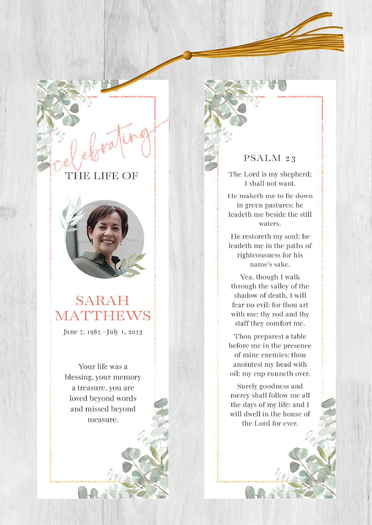 Free FedEx 2Day Shipping Included with orders over $50 (overnight shipping is available). Orders are printed and shipped the following day after the order is placed. No need to wait for a designer, you can customize this design yourself with our online design tool! It’s simple and easy. Just select the options below and click the “next” button to customize the design with your text and photos. You can also choose to have us customize the design for you. Our memorial bookmarks (front and back) are 2.5″x8.5″. All memorial bookmarks are printed on 110lb matte cover card stock or 110lb glossy cover card stock.