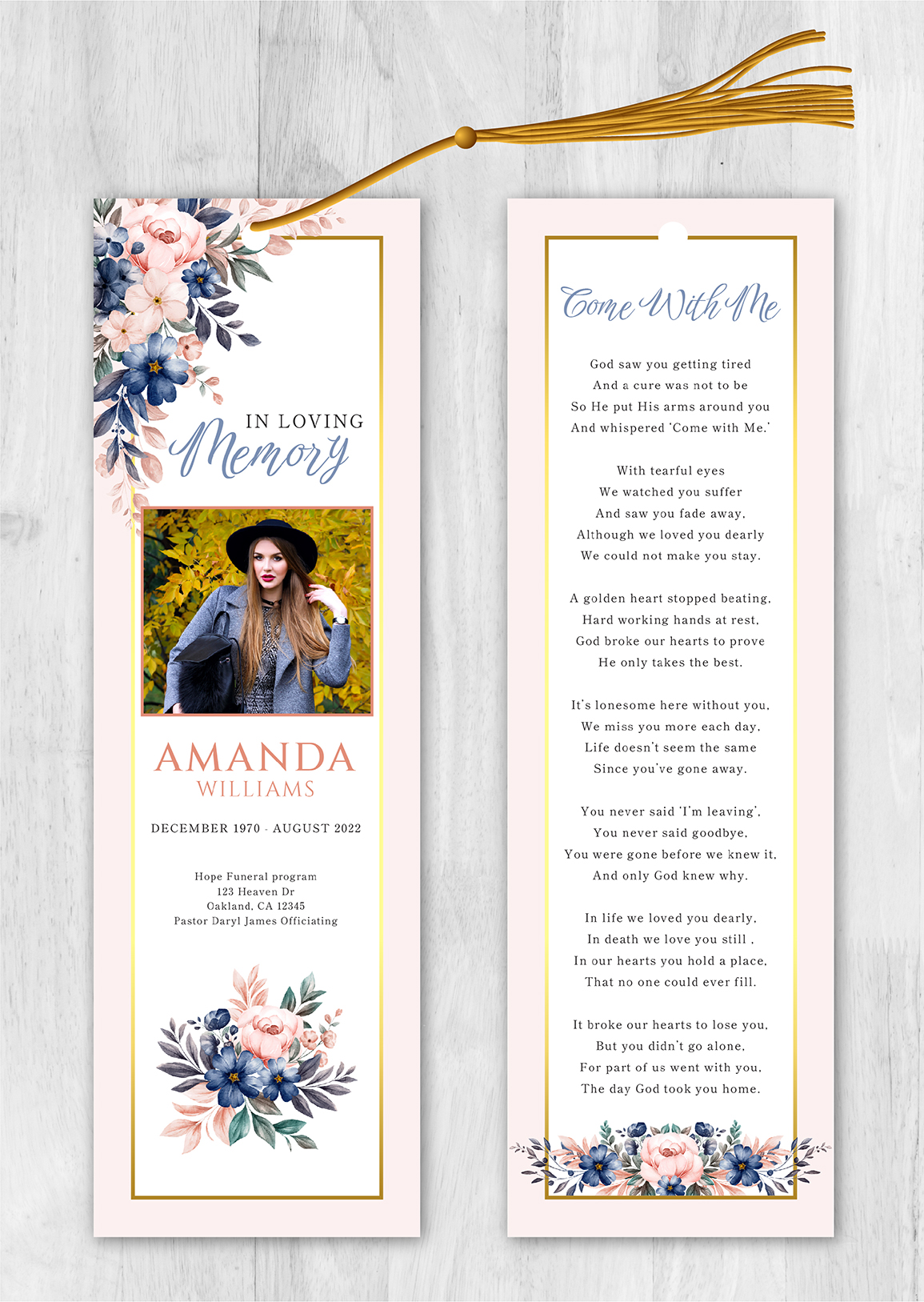 Free UPS 2-day Air Shipping Included with orders over $50 (overnight shipping is available). Orders are printed and shipped the following day after the order is placed. No need to wait for a designer, you can customize this design yourself with our online design tool! It’s simple and easy. Just select the options below and click the “next” button to customize the design with your text and photos. You can also choose to have us customize the design for you. Our memorial bookmarks (front and back) are 2.5″x8.5″. All memorial bookmarks are printed on 110lb matte cover card stock or 110lb glossy cover card stock.