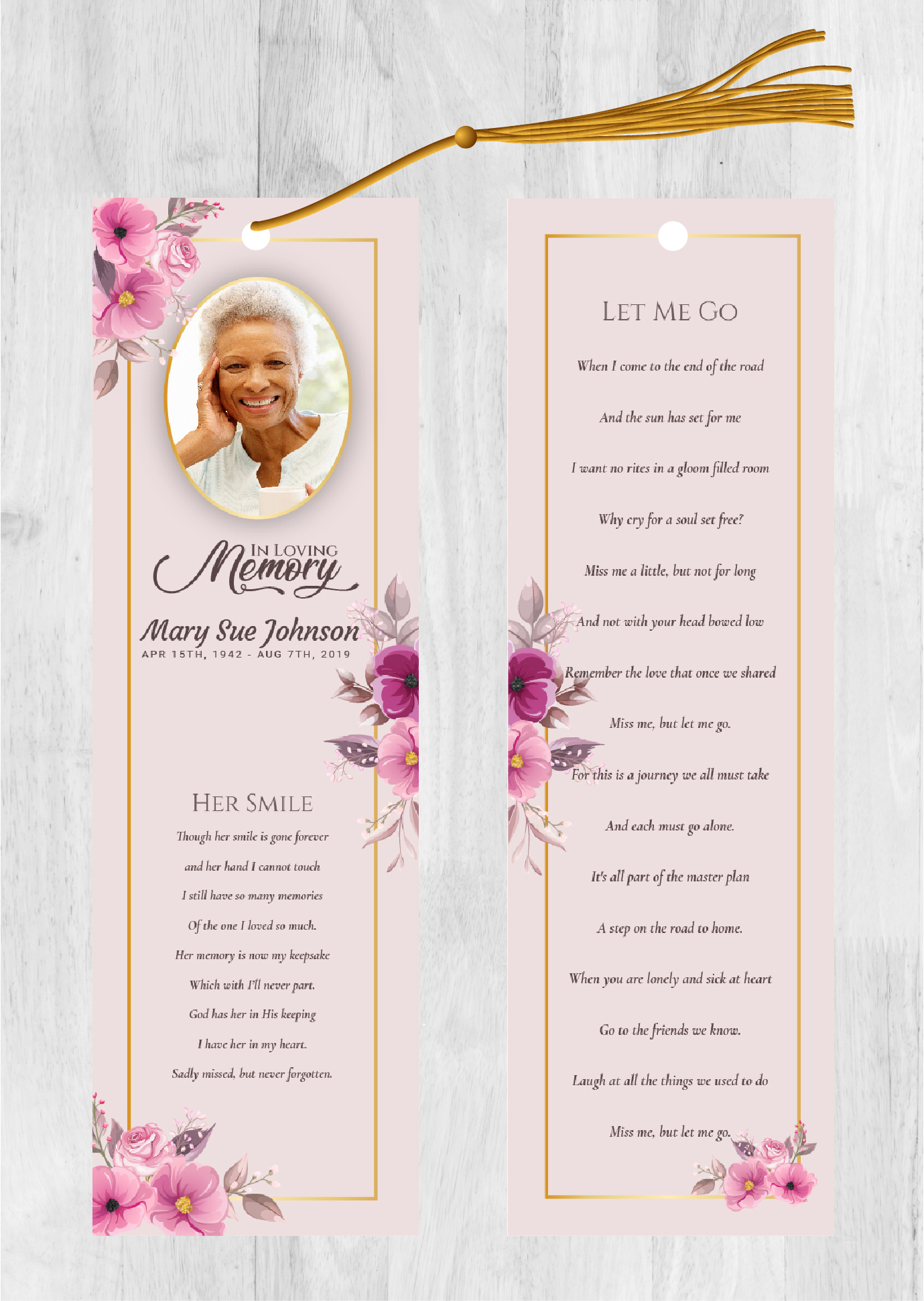 Free UPS 2-day Air Shipping Included with orders over $50 (overnight shipping is available). Orders are printed and shipped the following day after the order is placed. No need to wait for a designer, you can customize this design yourself with our online design tool! It’s simple and easy. Just select the options below and click the “next” button to customize the design with your text and photos. You can also choose to have us customize the design for you. Our memorial bookmarks (front and back) are 2.5″x8.5″. All memorial bookmarks are printed on 110lb matte cover card stock or 110lb glossy cover card stock.