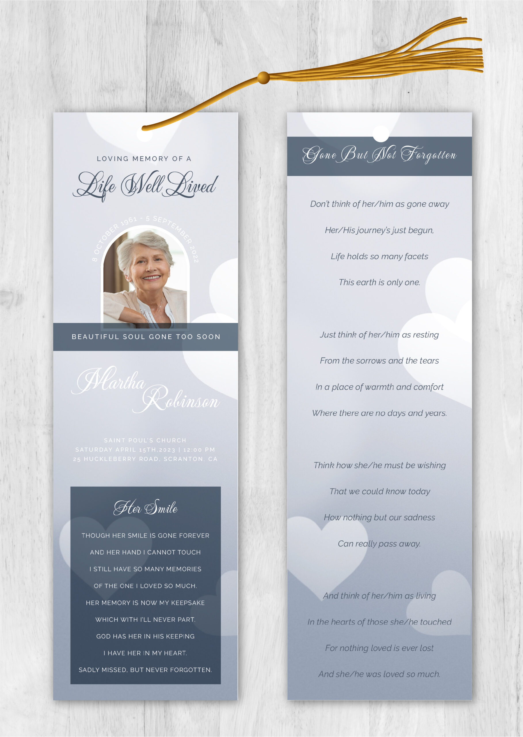 Free UPS 2-day Air Shipping Included with orders over $50 (overnight shipping is available). Orders are printed and shipped the following day after the order is placed. No need to wait for a designer, you can customize this design yourself with our online design tool! It’s simple and easy. Just select the options below and click the “next” button to customize the design with your text and photos. You can also choose to have us customize the design for you. Our memorial bookmarks (front and back) are 2.5″x8.5″. All memorial bookmarks are printed on 110lb matte cover card stock or 110lb glossy cover card stock.